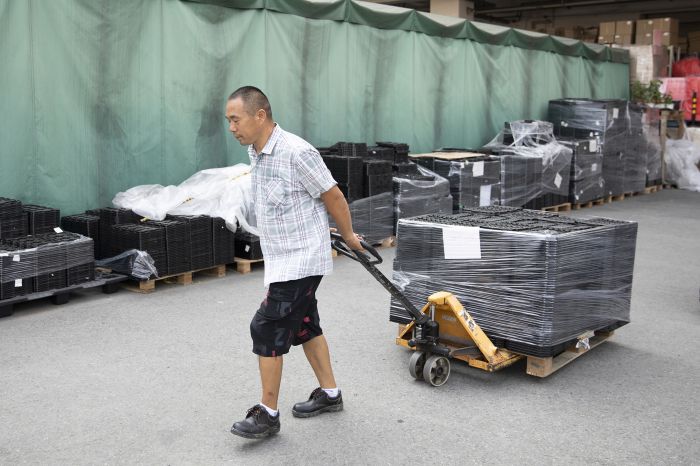 14时40分,周桃树刚刚从其他楼栋拉回包材,这是他今天拉的第9趟物料。周桃树是C10东侧码头包材岗的员工,他和同事们承担了10余个楼栋的包材收发任务。虽然生产暂停,但回收、整理包材的工作不能停。相邻几个楼栋的包材,全靠他们用油压板车运送。这样的天气,坐着不动就出汗,他拉着板车,汗水直往眼里钻。