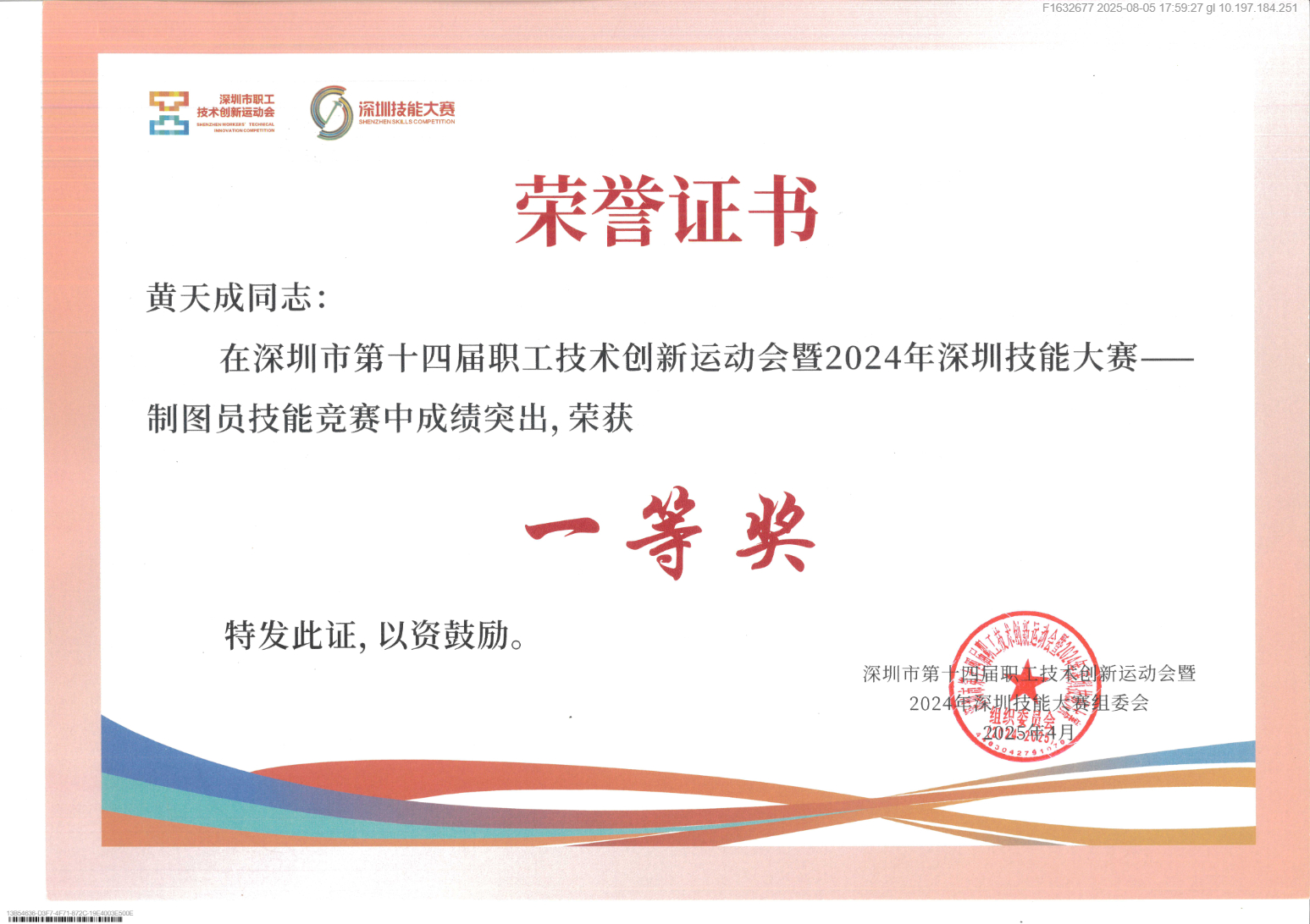 2022年至今,从市赛到省赛,黄天成已经斩获十多项荣誉。2024年7月,在全国行业职业技能竞赛——第四届全国仪器仪表行业职业技能竞赛广东省选拔赛仪器仪表制造工(远程测控技术方向)赛项中,他荣获职工组二等奖;2024年11月,在深圳市第十四届职工技术创新运动会暨2024年深圳技能大赛——制图员技能竞赛中,他一举夺魁。
