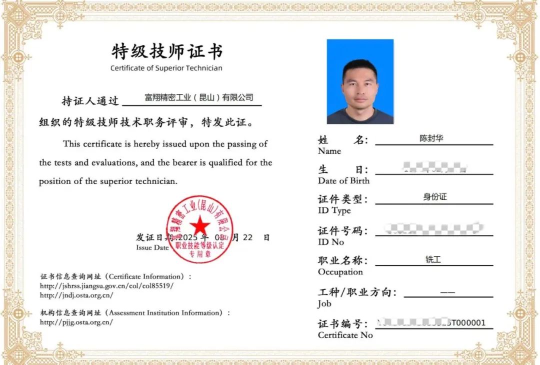 特级技师证书,是对陈封华二十五载扎根精密制造一线、追求技术极致的最佳褒奖。铣刀旋转,匠心永恒。他以坚守诠释初心,以创新驱动发展,以传承延续希望,在精密加工的方寸之间,书写一名富士康人精益求精的精神,也为集团的智能制造注入不竭动力。