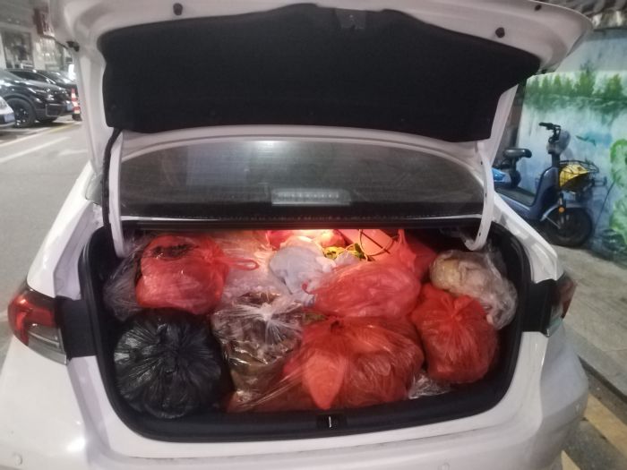 虽然万般不舍,但返程回深的日子还是来了。69岁的妈妈或扛或搬或抱,从客厅角落、厢房、阳台、冰箱、菜地拿来了给我准备的东西:40多斤腊肠、10多斤扣肉、28条粽子、3只鸡、5斤炸鱼块、2大瓶辣椒酱、4条大冬瓜,以及南瓜、青菜、白萝卜、蒜苗……除了这些自家出产的,还有从市场买的苹果、柑子、柚子、糖果。