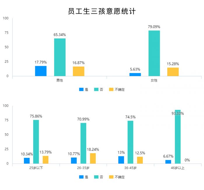 不过,政府放开三孩后,有些员工也动了心思。可想想生娃后带来的连锁反应,他们又纠结到底要不要加入生三孩的阵营。在此次问卷调查中,对于生不生三孩这个问题,就有16.02%的员工表示“不确定”。