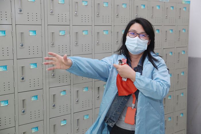 早上7:50,梅姐来到她位于D10栋四楼的鞋柜前,开鞋柜、穿静电衣、换静电鞋,一气呵成。穿上“战袍”,她就是一名无所不能的“超级战士”。